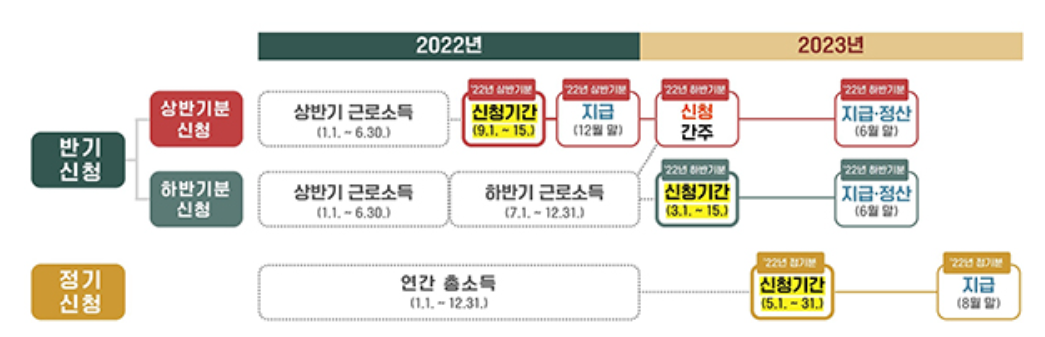 하반기 소득: 2022년 7월~12월 근로소득에 대한 신청으로 3월 1일 ~ 3월 15일입니다.